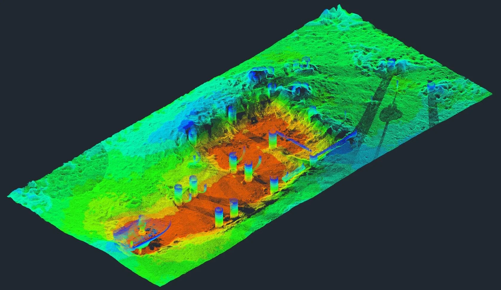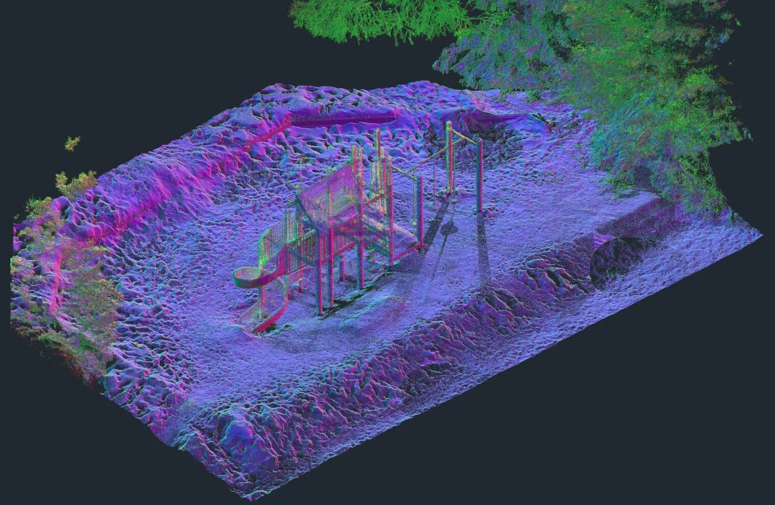 High Definition Laser Scan of park playground equipment with normal mapping color scheme.